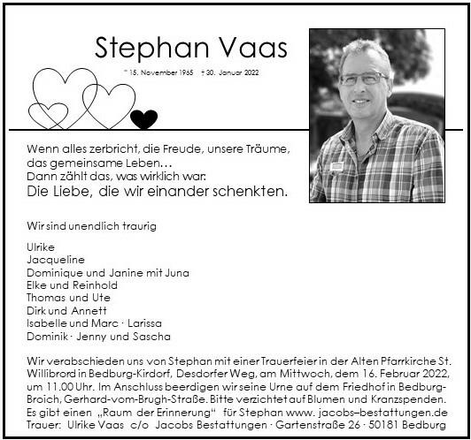 | Beisetzung | Mittwoch, 16.02.2022 | Im Anschluss gegen ca. 11:45 Uhr | Friedhof in Bedburg-Broich, Gerhard-vom-Brugh-Straße |